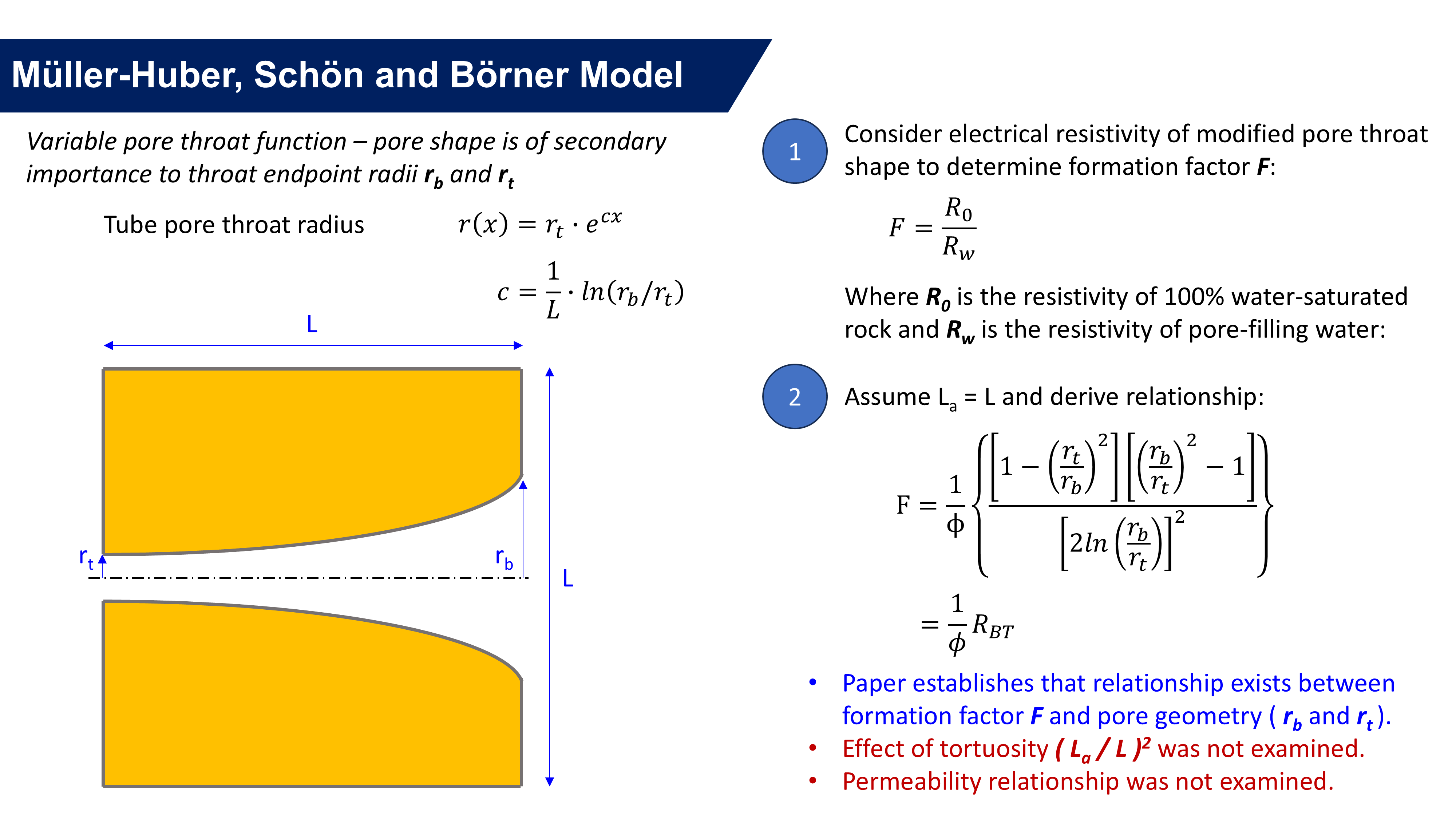 Müller-Huber, Schön and Börner were interested in using this model to improve understanding of formation factor and resistivity measurements. They define the variable pore throat radius using the equation shown in Figure 7 which creates a curve between rt and rb.