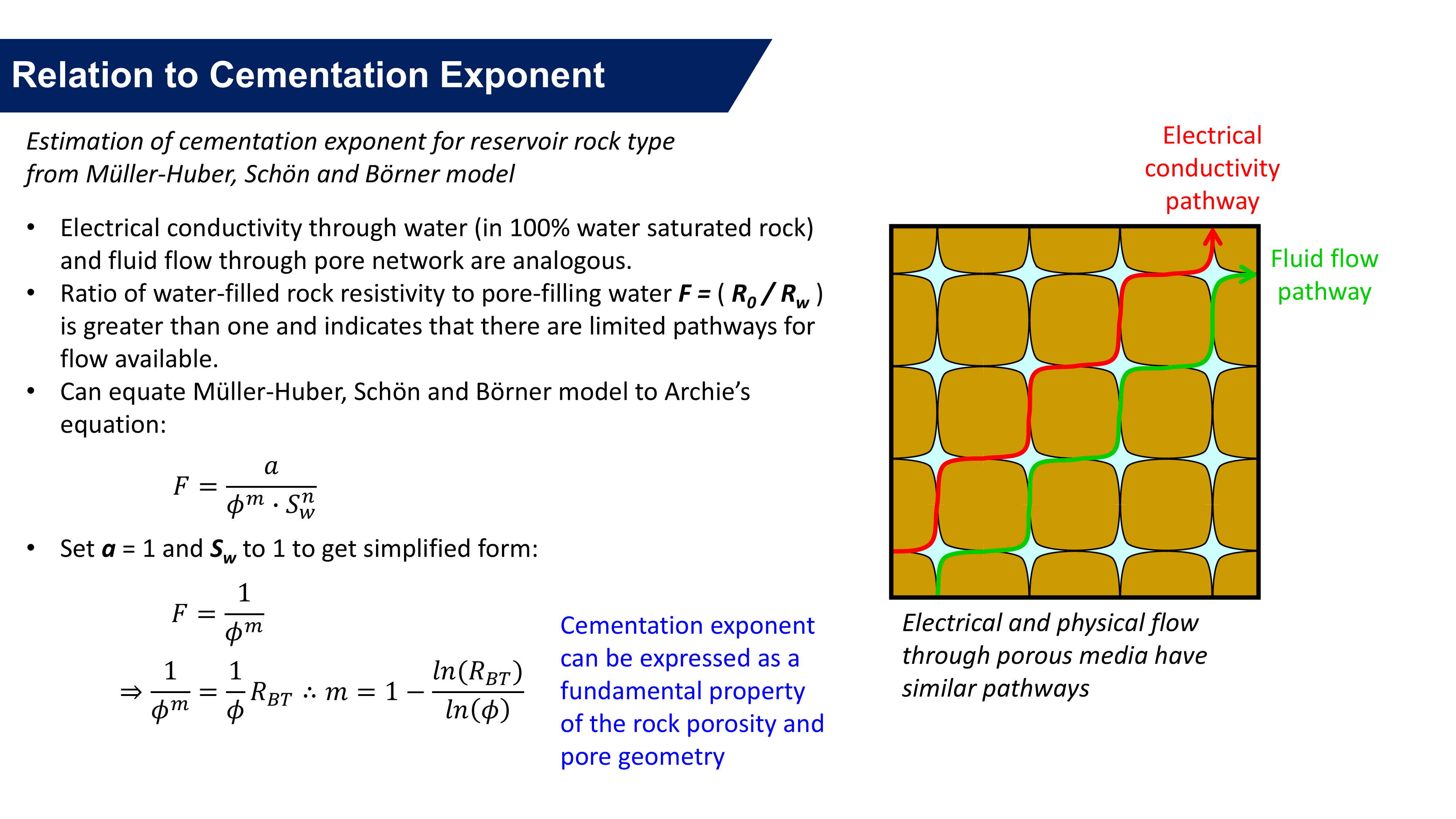 \[m=1-\frac{\ln(R_{BT})}{\ln(\phi)}\]The cementation exponent is a measure of the flow path complexity in the rock fabric.