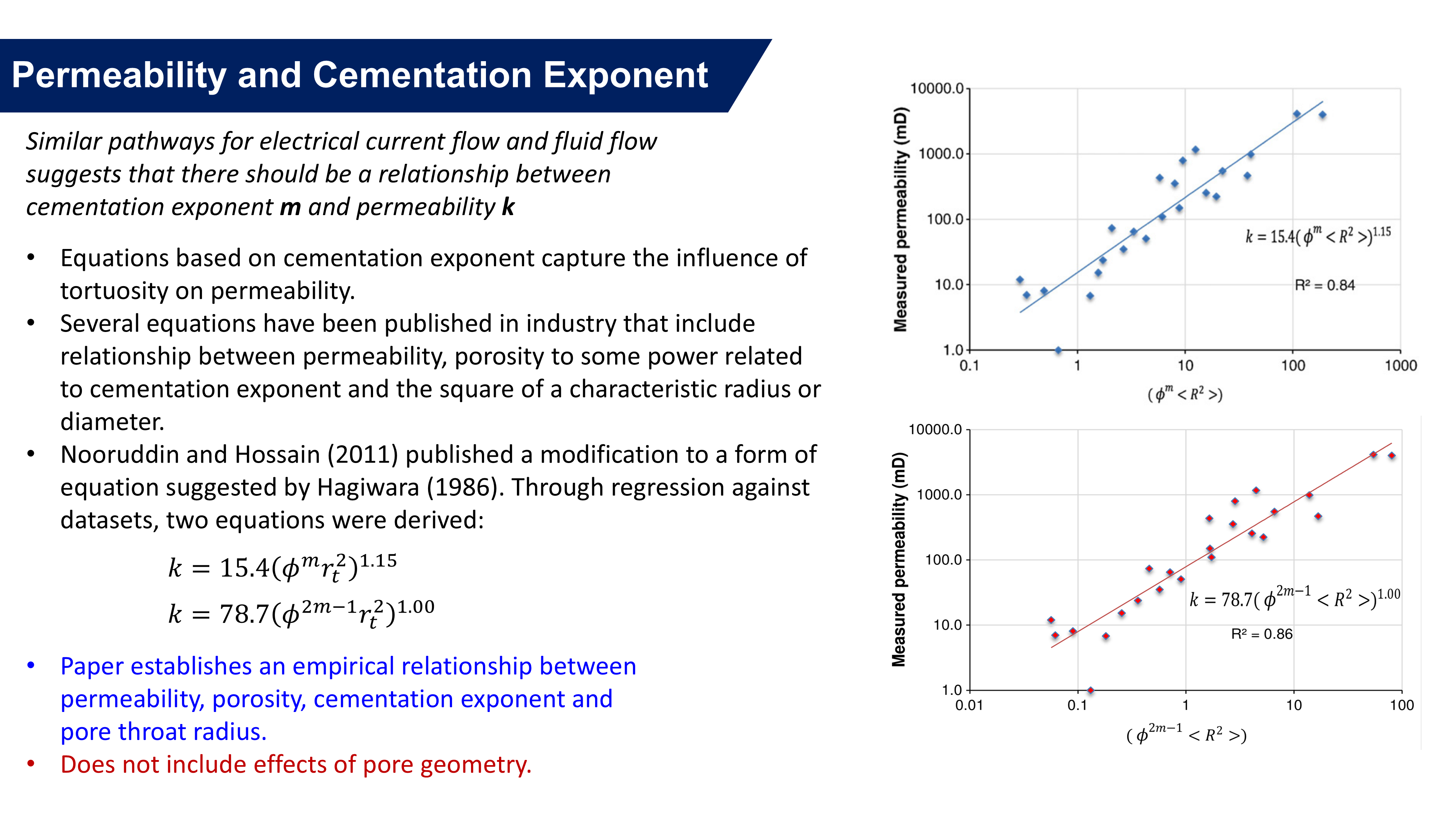 Can we predict permeability using the cementation exponent? Fortunately many researchers in the past have wondered the same thing and there are many permeability equations that incorporate cementation exponent into their form in lieu of a tortuosity term. For example there are the equations published by Nooruddin and Hossain (2011):