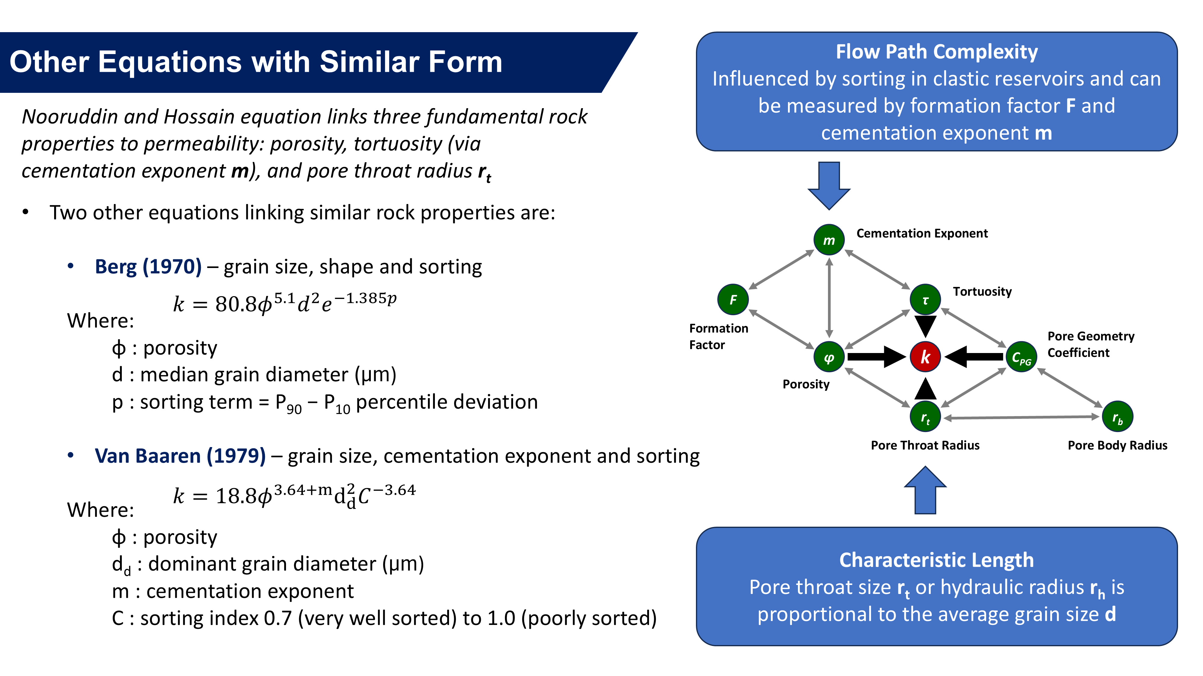 If we recall the fundamental properties that influence permeability shown on Figure 3, these equations essentially account for three of the four primary drivers. Tortuosity is controlled by the length of the flow paths relative to the gross length along the rock. More complex flow paths are revealed by higher cementation exponent. The pore throat radius is related to the characteristic length used in each equation. For Berg and Van Baaren, this is the average grain diameter. Small grain sizes will proportionally be associated with smaller pore throat sizes. Thus it appears that these equations all have a similar basis.