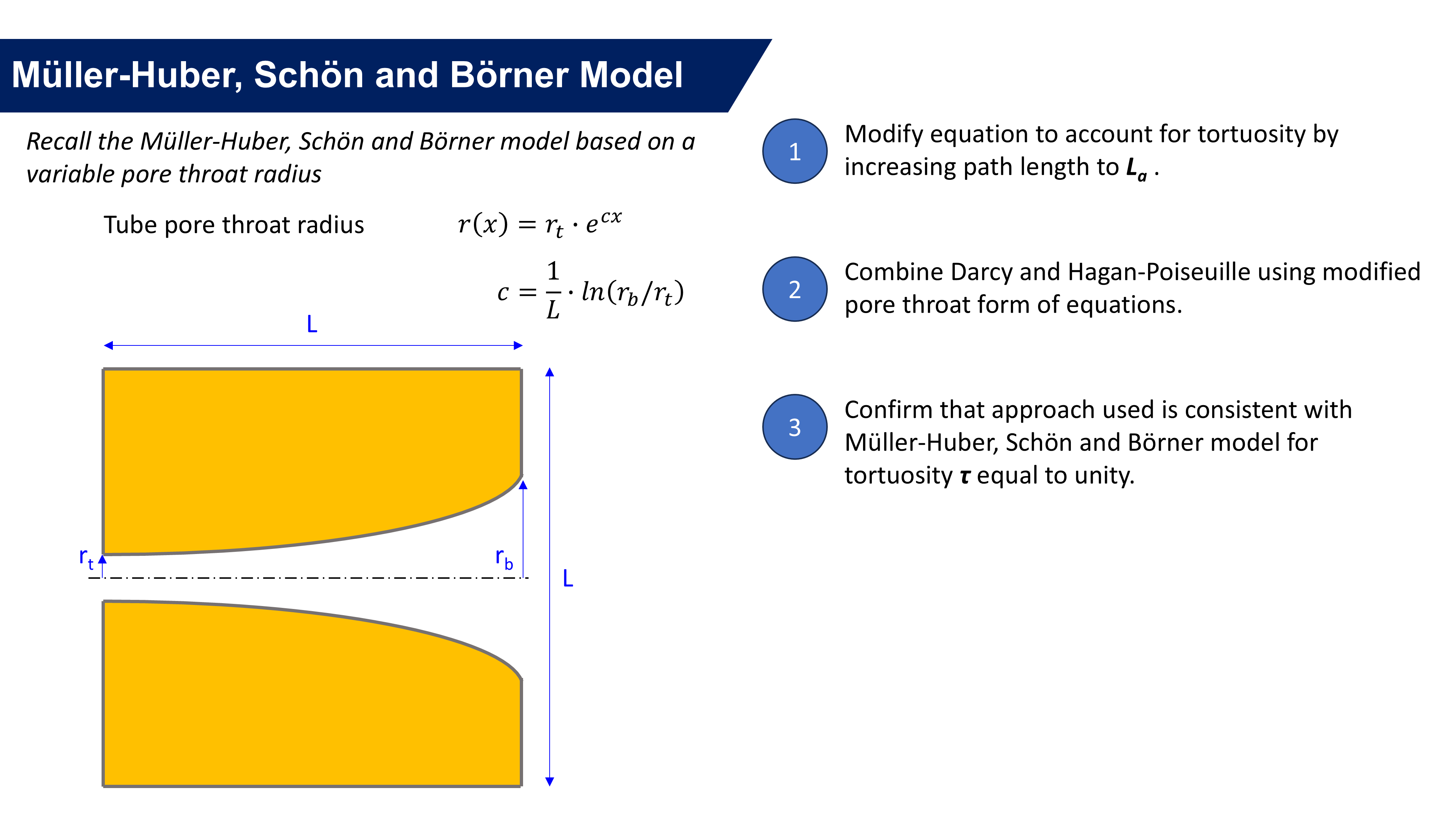 The overall outline of the modification procedure is shown in Figure 11. The modified pore throat model used by Müller-Huber, Schön and Börner did not include the effects of tortuosity through the actual length of the tube. Our first step will be to include this term as it is important to capture tortuosity in the Kozeny form of equation.