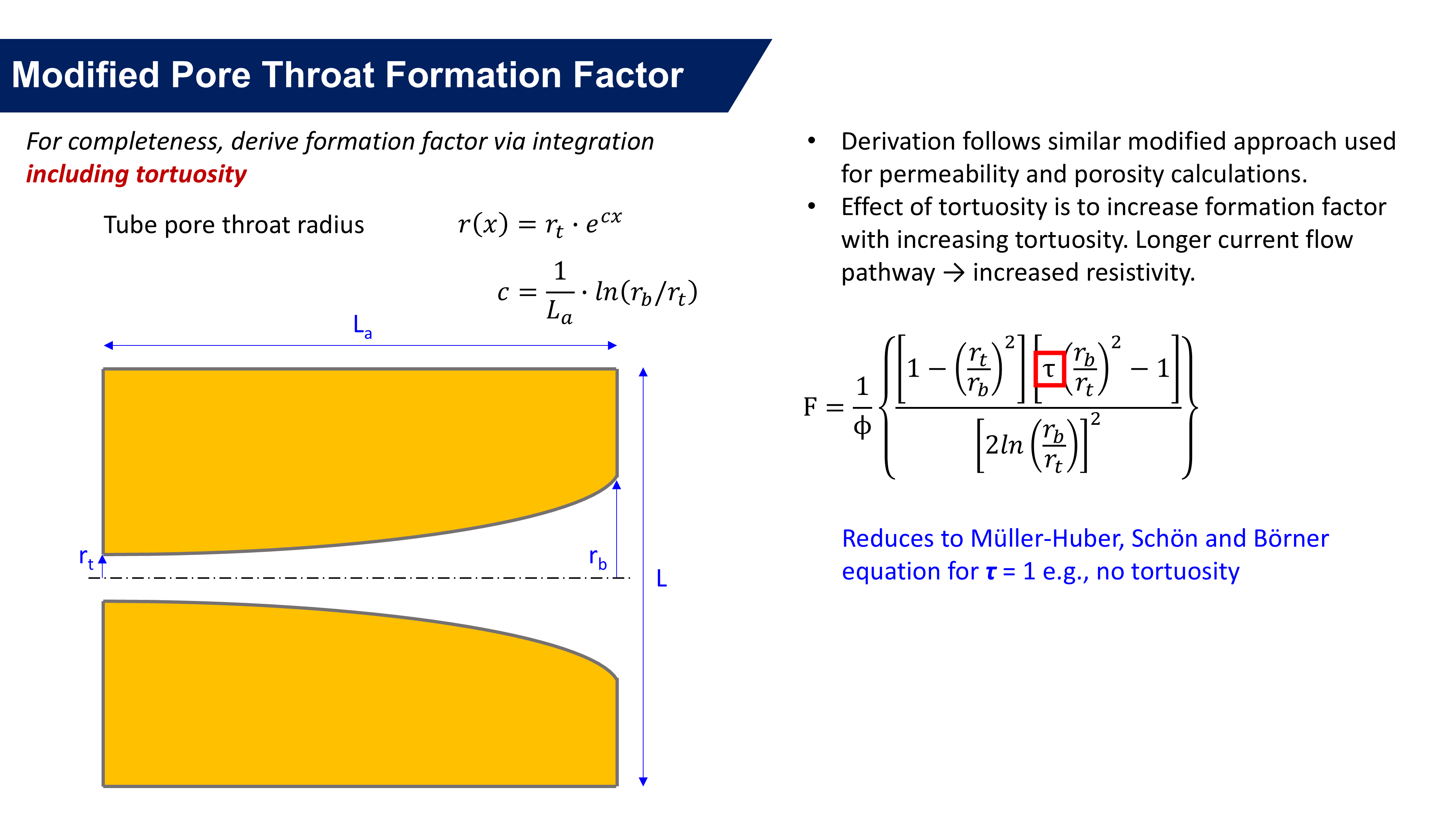 According to their paper, the exact equation doesn’t matter as much as the introduction of different tube radii at each end. Their analysis is based on an understanding of electrical resistivity. The presence of a rock matrix means that the conducting path for electricity follows a tortuous path through the rock and cannot conduct through the matrix itself. Thus both the porosity and the pore geometry affect the resistivity of the water-saturated rock R0, in comparison to the resistivity of the pore-filling water Rw in the absence of a porous medium. The ratio of these two resistivities is the formation factor.