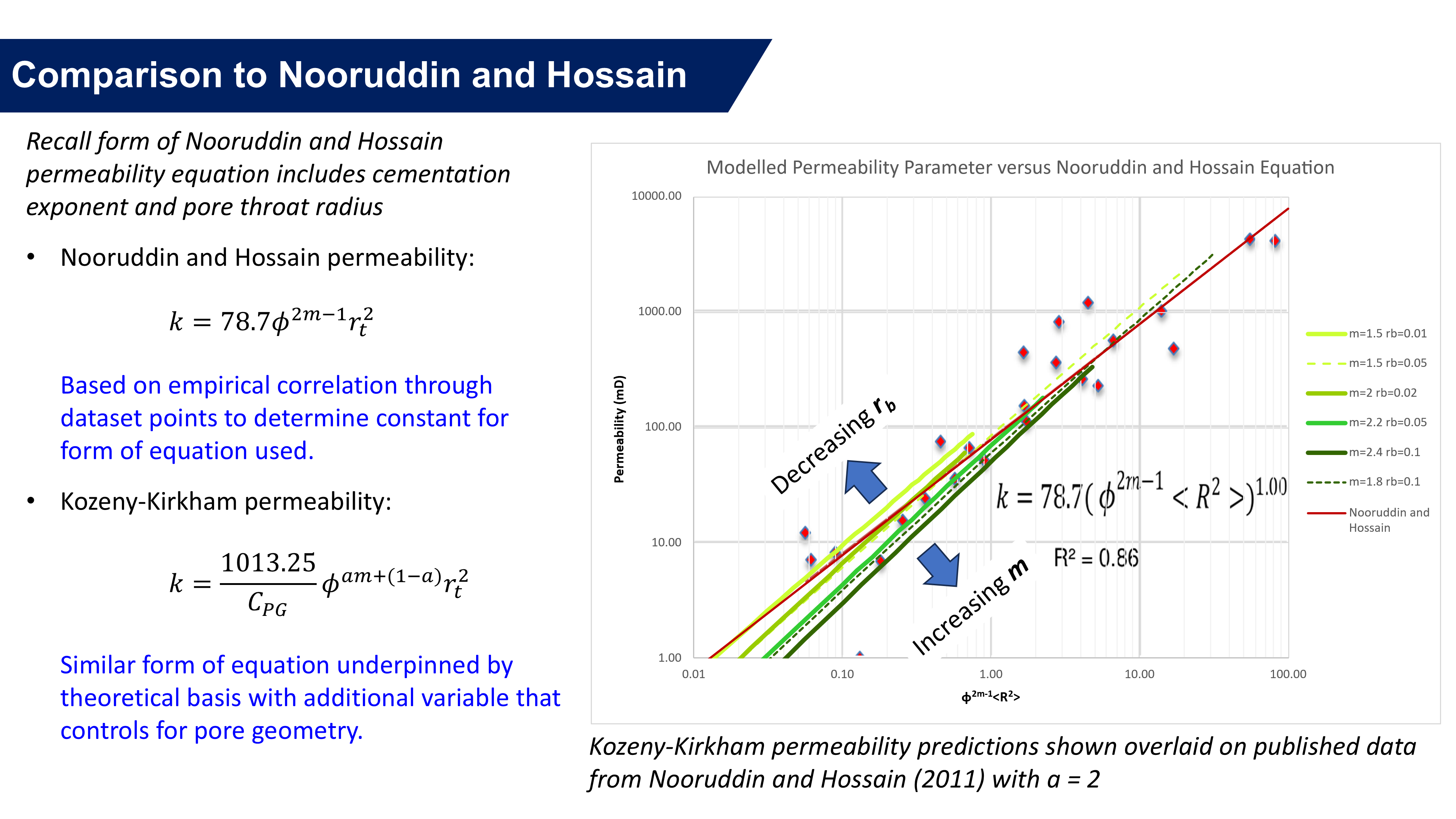 The Nooruddin and Hossain equation links together three fundamental rock properties and relates them to permeability. These properties are the porosity, tortuosity (which is captured in the cementation exponent), and the pore throat radius.
