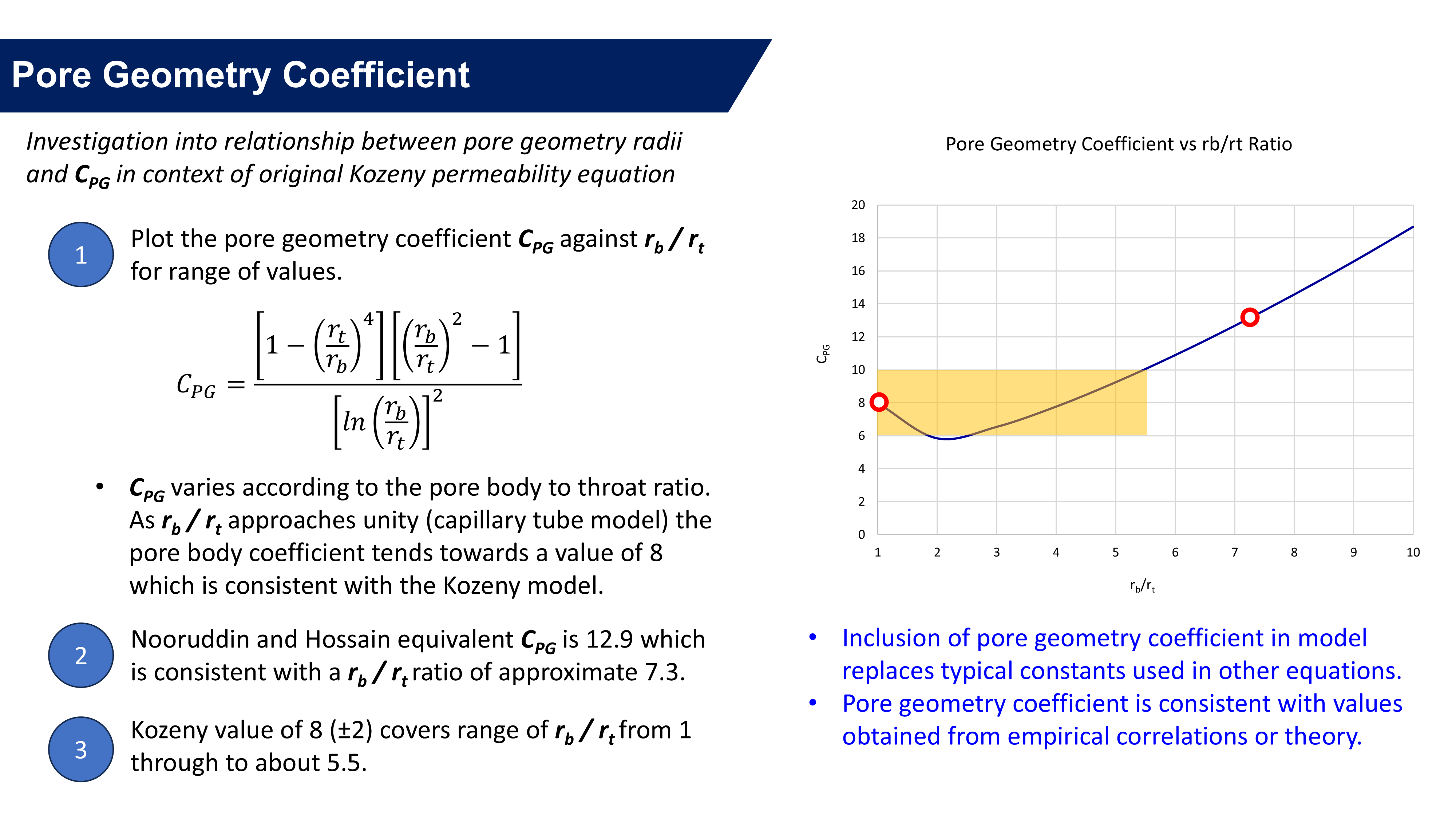 We can plot the variation in pore geometry coefficient against the pore body to throat ratio as shown in Figure 17. At a ratio of 1, where the pore body and pore throat are identical in size, the pore geometry coefficient tends towards 8, which is the same as that in the Kozeny equation. Similarly, we can plot the Nooruddin and Hossain equivalent pore geometry coefficient, which is 12.9. This is consistent with a pore body to throat ratio of about 7.3.