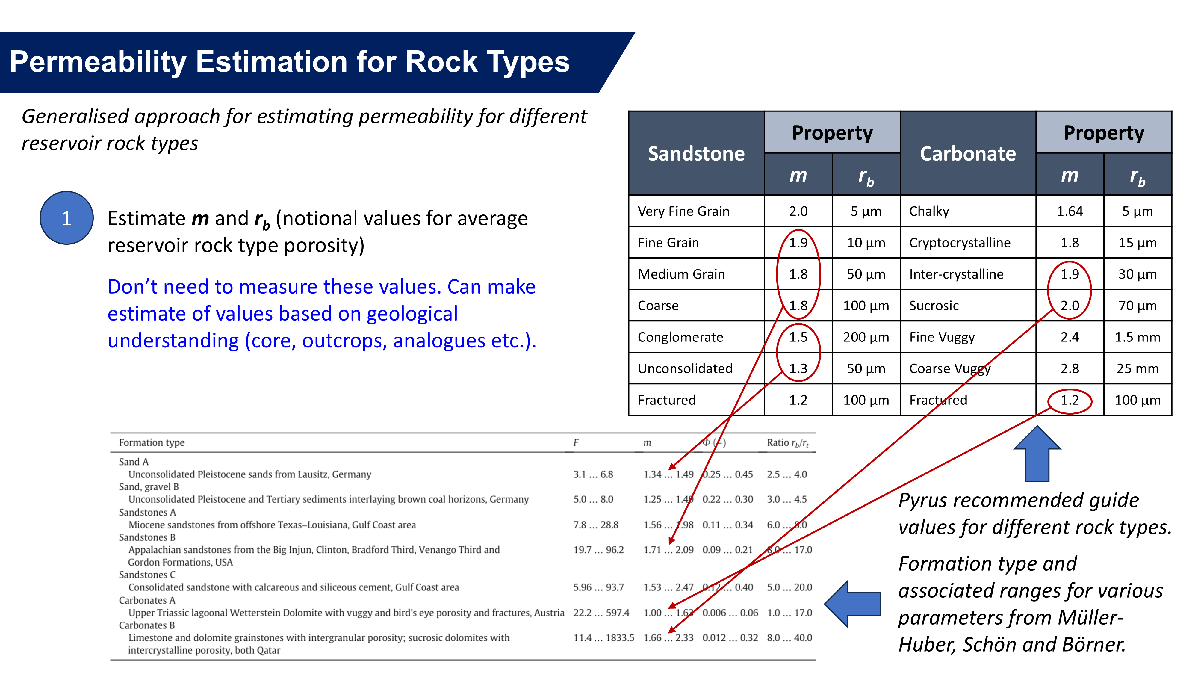 This long blog post introduces the theory behind the Kozeny-Kirkham equation that is applied in the Pyrus rock model. What is not shown is how to estimate the cementation exponent and pore throat radius for different rock types, such as sandstone and carbonate. A method to estimate these parameters from grain size and sorting (in the case of sandstones), and rock fabric number and dolomitisation (in the case of carbonates) has been devised in Pyrus and will form the topic of another blog post(s).
