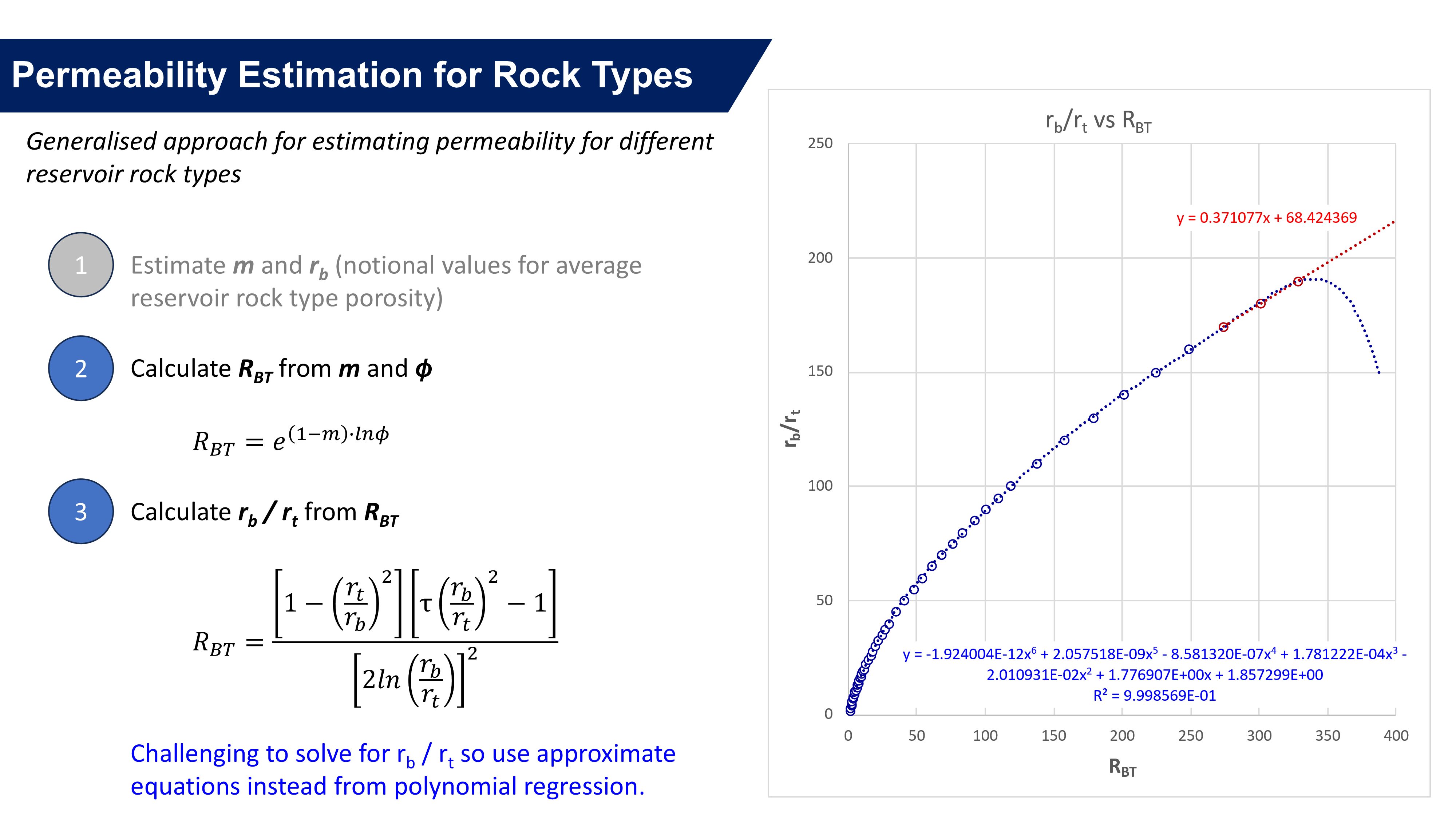 We are getting ahead of ourselves though, as the previous example calculated values for pore throat radius and pore geometry coefficient, without any explanation as to how this was done. Let’s step back a little and work through an example workflow for the recommended approach to using the Kozeny-Kirkham equation.
