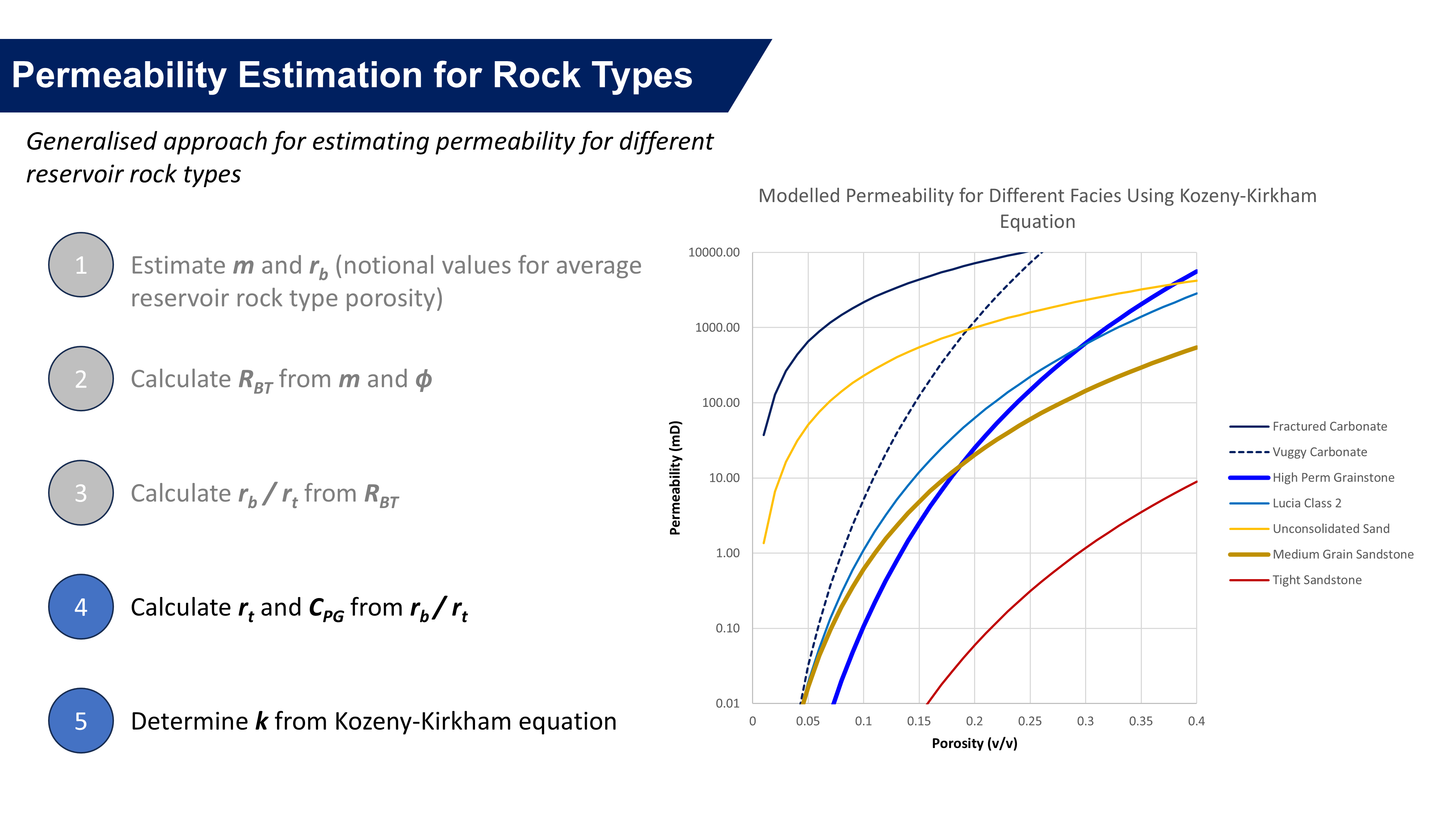 The generalised Kozeny-Kirkham permeability equation appears to be versatile enough to cope with different reservoir rock types.