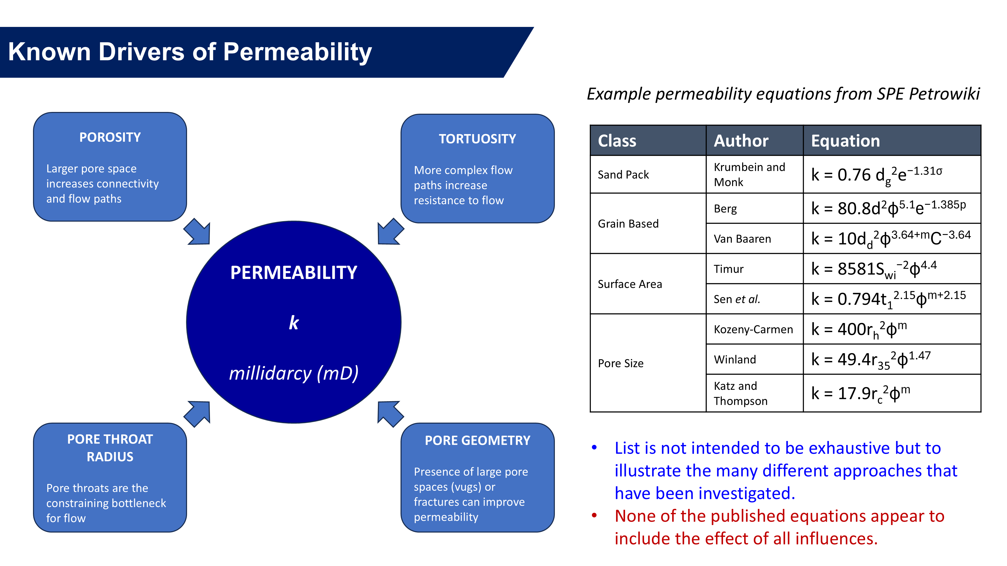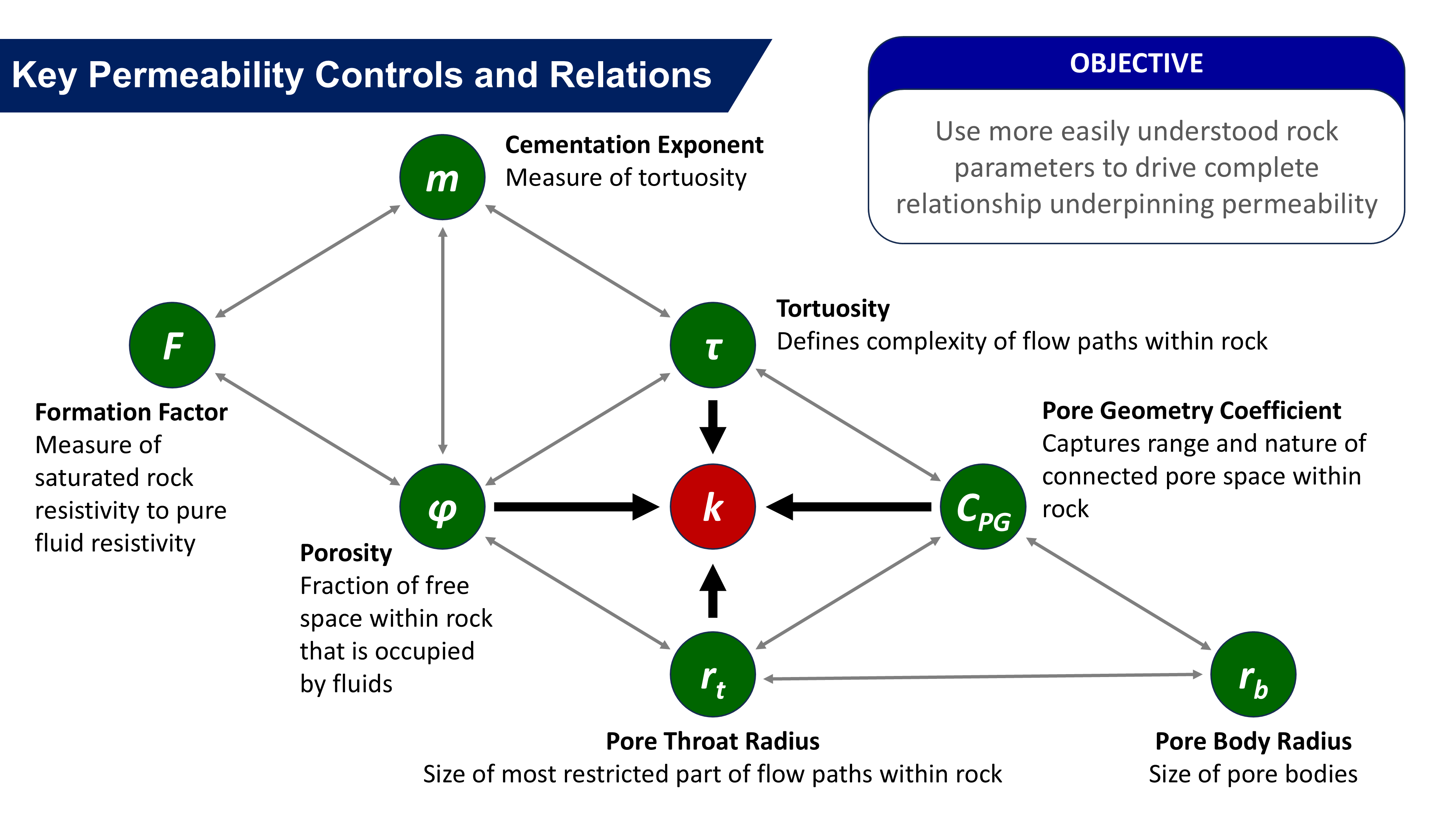 Firstly there is the most fundamental relationship which are the parameters that are directly related to permeability. There is a relationship between porosity, tortuosity, the pore throat radius and the pore geometry. Together these all control permeability.