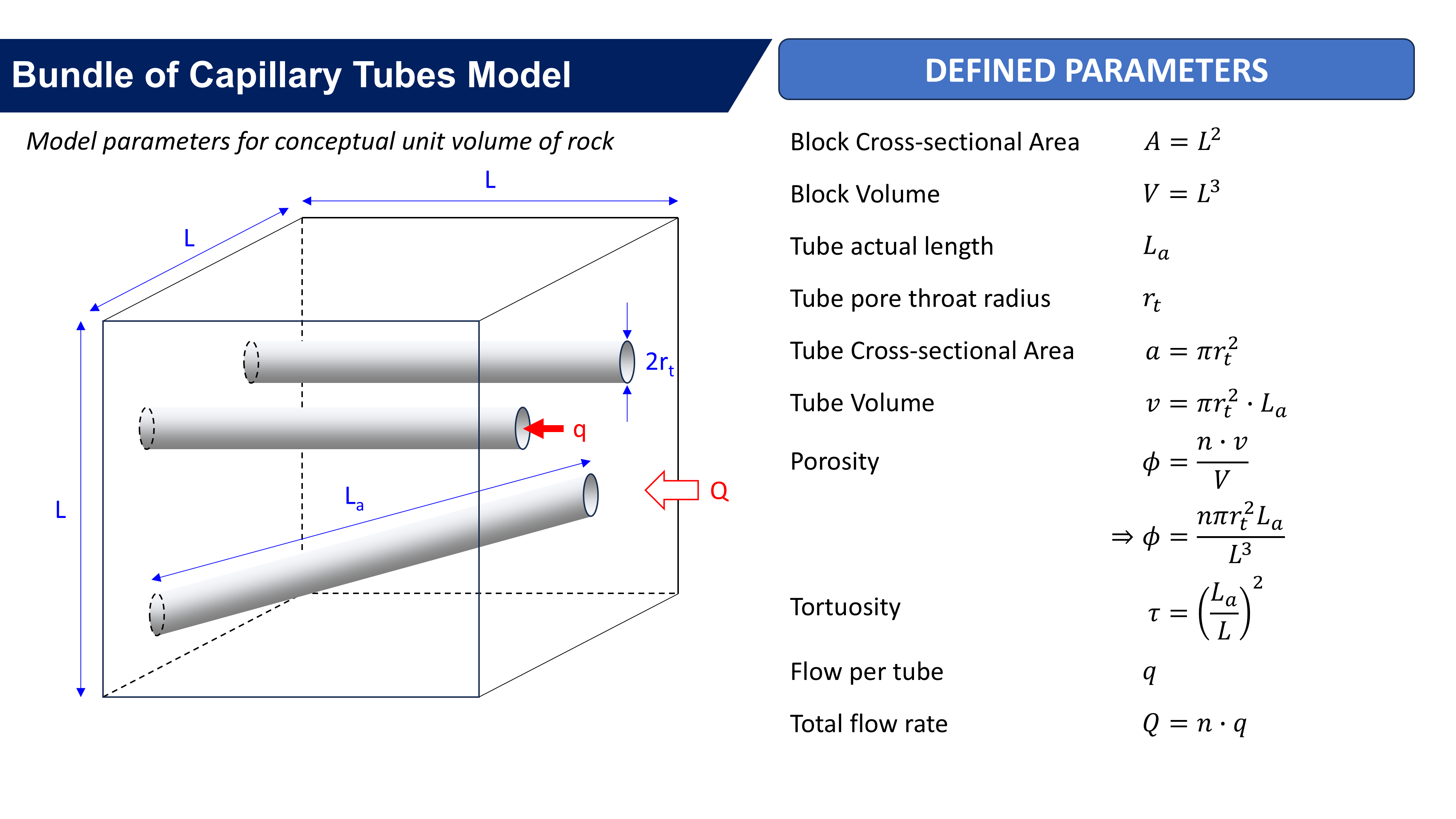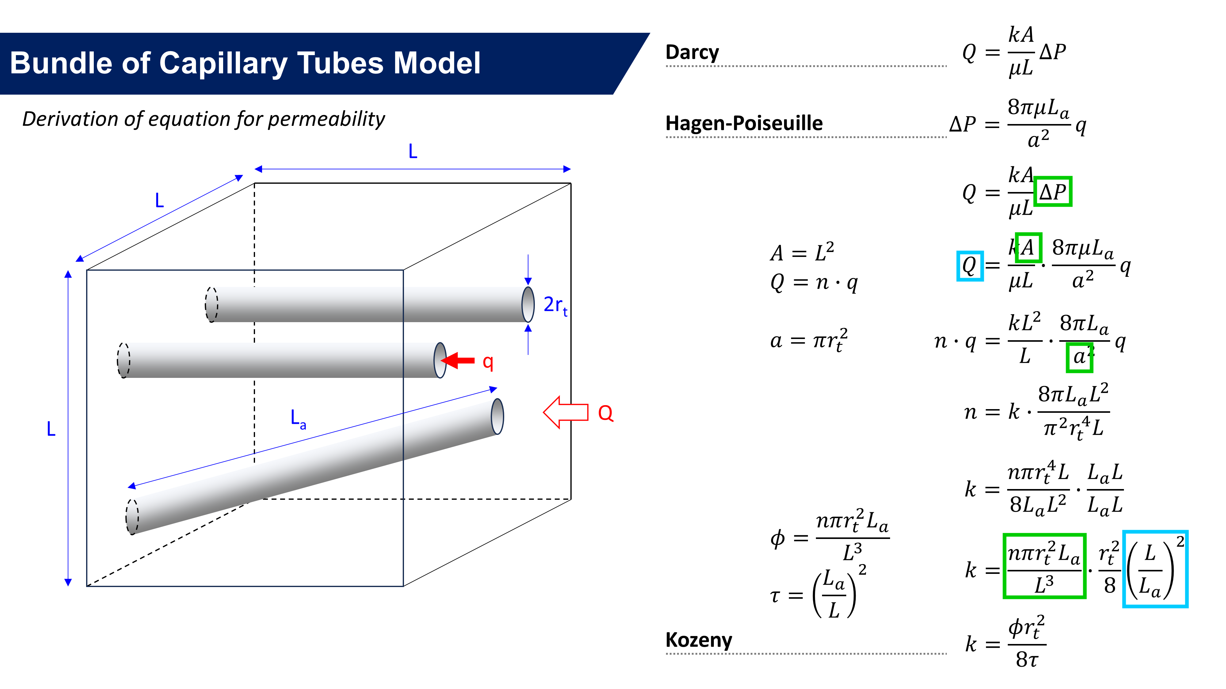 The capillary tubes model is deceptively simple and it is important to understand how it is derived. I have a suspicion that whilst many are aware that the Kozeny permeability model is derived from the capillary tubes model, the majority using the Kozeny equation have never actually checked by deriving it themselves.