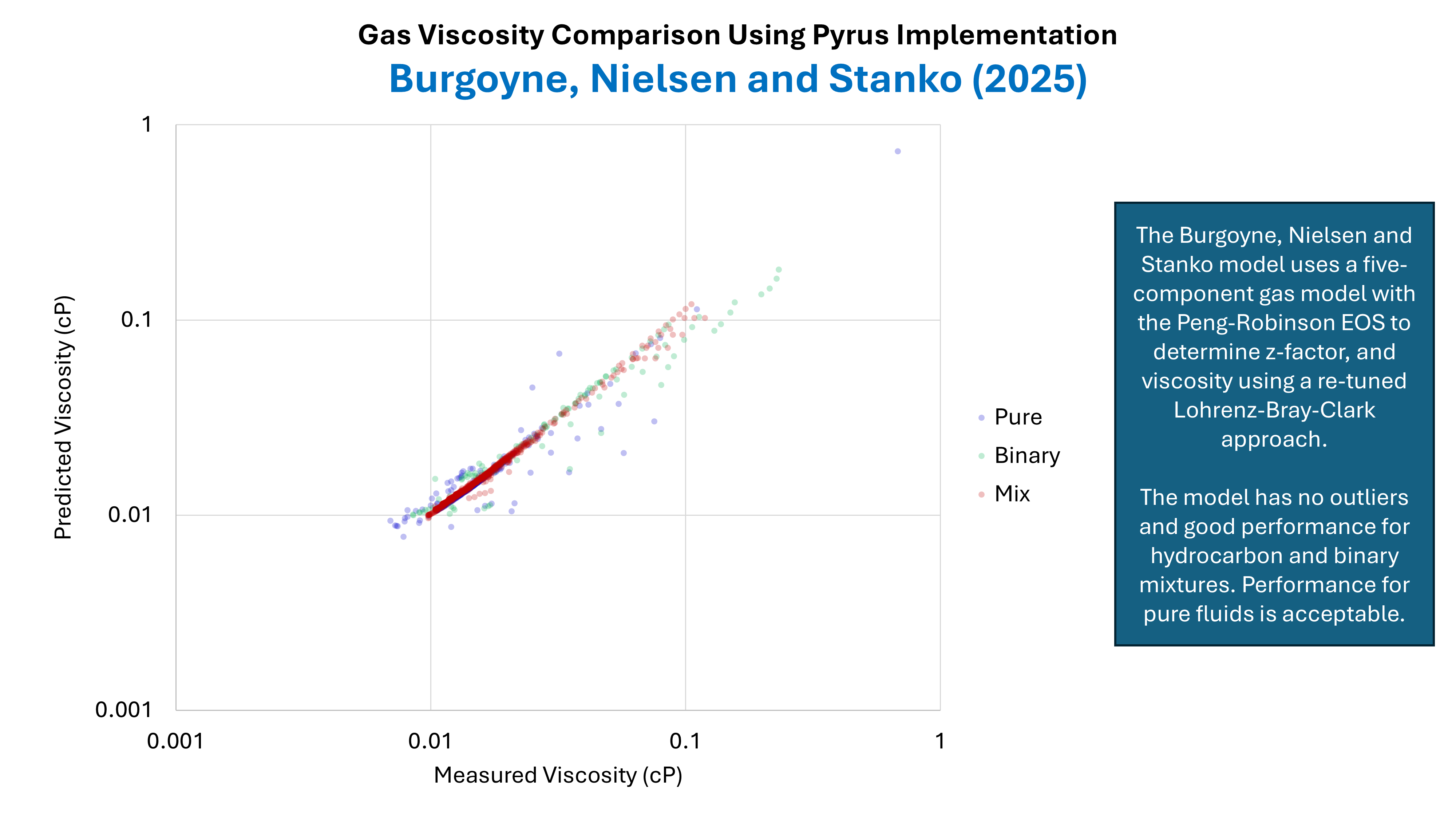 A dataset comprising 1,156 data points was compiled from published data in the literature. This dataset will be described more fully in a future blog post. The dataset contains pure fluids, binary mixtures and hydrocarbon mixtures. The predicted viscosities versus the measured viscosities for BNS are shown in Figure 3. This shows reasonably good performance for hydrocarbon fluids, with slight scatter for binary mixtures and pure fluids. Compared to some other viscosity methods (not shown) the BNS method does not appear to contain any outliers that can sometimes occur with unusual fluids. Note that the apparent poorer predictive quality for hydrocarbon mixtures near to 0.1 cP is related to the very high pressures associated with these data points which is in excess of 15,000 psia.