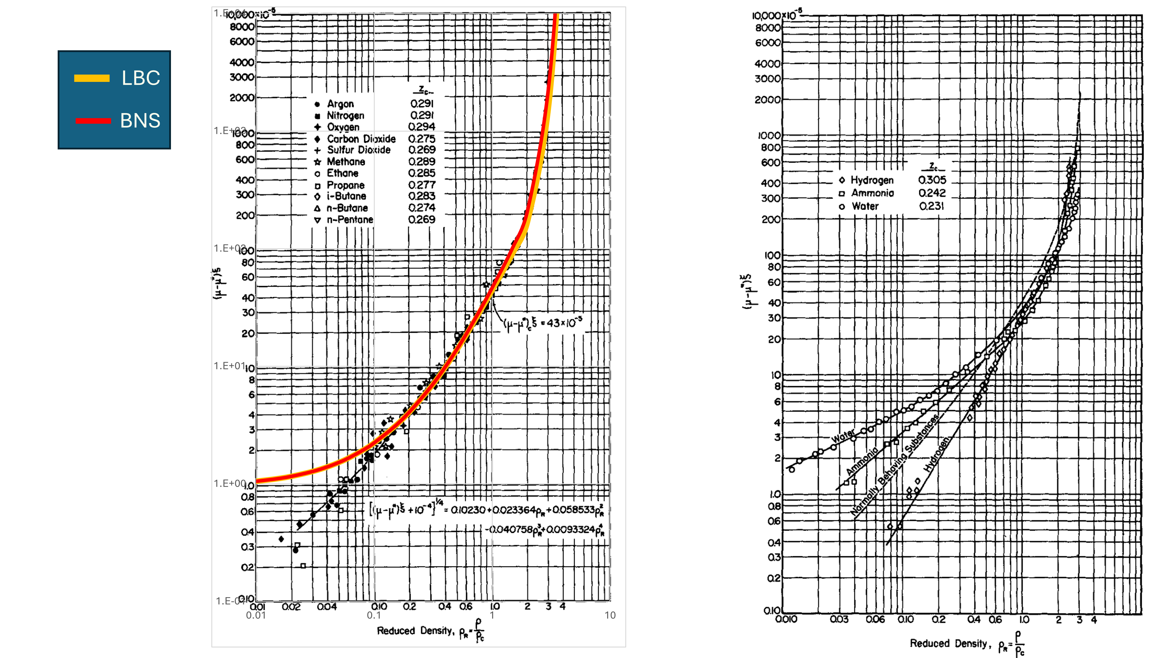 The LBC viscosity method is based on the observation that the residual viscosity multiplied by a viscosity reducing factor is related to the reduced density of a fluid. LBC uses the relationship of Jossi, Stiel and Thodos (JST) (1962) and this is shown in Figure 1 below. By determining the reduced density, it is thus possible to obtain the viscosity of a fluid.