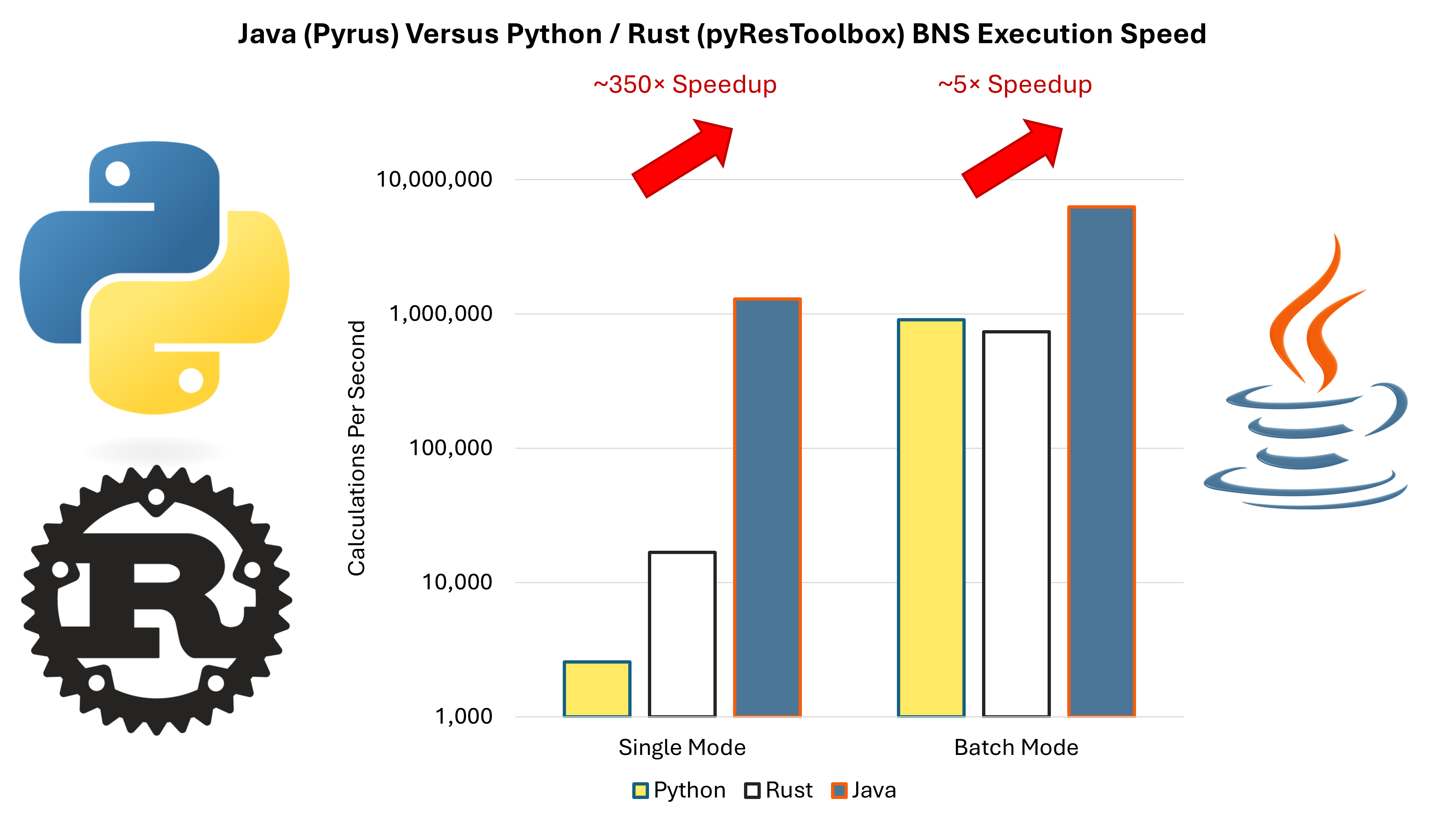 Amount class was stripped out to speed up execution in Java. For example, rather than using double t_degr = Amount.valueOf(temperaure, FAHRENHEIT).doubleValue(RANKINE);, it has been replaced with double t_degr = temperature + 459.67; // degF to degR. This removes a lot of the overhead of JScience Amount class. Usually I am fastidious about units, as explained in my post on use of generics for physical units, but in this case the low-level code can't justify the overhead for simply converting between Fahrenheit and Rankine. Benchmark results with the code as shown in this blog post are about 2× to 3× slower.The speed up obtained is shown graphically below in Figure 4. Note the use of the logarithmic scale. This was necessary as otherwise the number of calculations per second for the single mode Python implementation was not a visible bar on the chart. The Rust implementation introduced helps to speed up the single mode methods, but has little effect on the batch mode. This is likely because in batch mode the code is able to take advantage of Numpy acceleration which uses C during loops instead of interpreted Python.